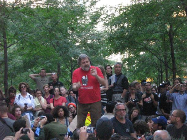 Žižek arriva puntuale a mezzogiorno preciso, porta una maglietta rossa con sopra Marx ed Engels stilizzati, sale su una panchina e inizia a parlare. La sua gestualità è straziata da continui tic nervosi che però, man mano che il discorso avanza, riescono a prendere un loro ritmo (si tocca prima il petto, poi la faccia e infine fa un gesto in avanti ad indicare Wall Street) e ad accompagnare alla fine fluidamente il discorso. Non è permesso l’uso dei megafoni così l’oratore dice una frase molto breve, tipo “we are not dreamers”, e quelli vicino a lui la ripetono ad alta voce in coro, poi il cerchio successivo di nuovo, di modo che “we are not dreamers” rimbalza di voce in voce fino ai bordi della piazza. Da dove verrà questa tecnica? Oceanici raduni religiosi nel West, comizi sindacali di fine Ottocento, chi lo sa? Ma ne nasce un’onda ritmata e potente che vocalizza l’intera comunità, con l’eccezione di quelli dei tamburi che naturalmente continuano nelle loro percussioni. Žižek inizia rivoltando contro Wall Street le accuse che sono di solito portate al movimento, sono i boss della finanza i sognatori che si illudono che il mondo possa andare avanti così, sono pagani e non cristiani, sono loro i distruttori della proprietà, basta guardare ai guasti portati dalla crisi, sono loro i sabotatori della famiglia, dato che è per colpa della loro recessione se milioni di famiglie si trovano nei guai. Non si concede piaceri demagogici, dice che sappiamo quello che non vogliamo ma siamo un po’ meno sicuri su quello che vogliamo, ricorda che non dobbiamo diventare una rivolta moralista contro la corruzione ma cambiare invece il sistema. Poi arriva al cuore del suo discorso, “non innamoratevi di voi stessi”, che significherebbe non fatevi prendere dalla gioia di questo momento qui in piazza con tutti questi amici, perché se fate così vi dimenticate di tutto quello che c’è da fare nel vasto mondo che ci circonda. Quest’idea lui la riesce a dire in tre parole esatte “Carnivals come cheap”, i Carnevali costano poco, ma lasciano il tempo che trovano, anzi peggio perché poi arriva la Quaresima.
