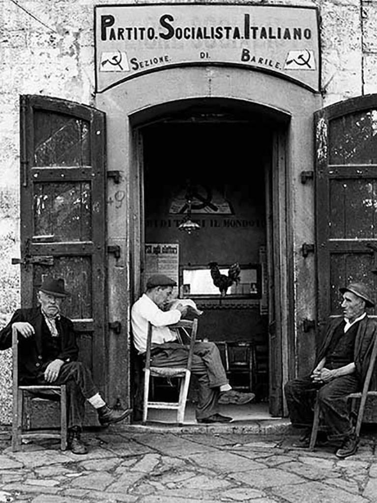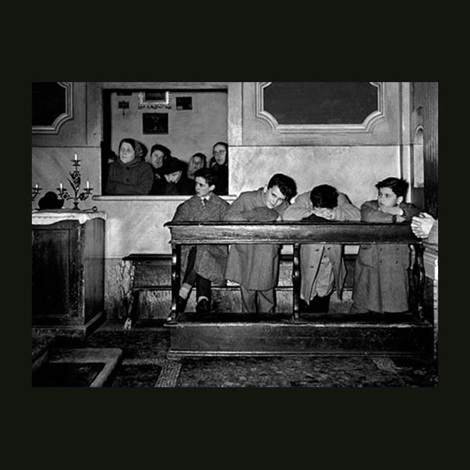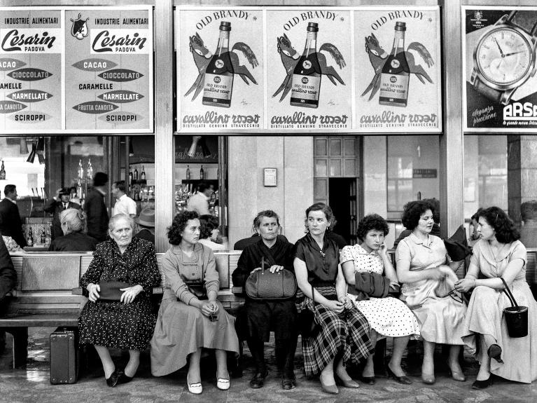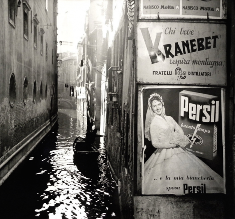 In Venezia (1958), un manifesto pubblicitario mostra in primo piano una giovane donna in abito da sposa, posta accanto alla scatola del detersivo Persil, che “lava presto, bene e tutto”, per un bucato lampo. E nello schema concettuale della fotografia, questa immagine nell’immagine è messa in dialogo e in rapporto semantico con il reale bucato, steso tra due case sul canale, visibile in secondo piano. In Gente dell’Emilia (1955), quattro bambini stanno “sentendo” messa in modo distratto. Dietro di loro, sul lato sinistro, un’apertura rettangolare lascia vedere invece un gruppo di pie donne nel matroneo, ispirate dal rituale cattolico, completamente rapite dalla discesa dello spirito santo in quel luogo sacro. Anche qui la finestra apre al rapporto tra superficie del reale e rimando a significati altri suggeriti dall’immagine dentro un’altra possibilità interpretativa dell’immagine. Ciò che si muove al di là delle vetrine, all’interno dei bar, e in primo piano, nei due scatti delle serie Gente del Nord (1950) e Gente dell’Emilia (1959), rappresenta la coesistenza di più livelli e piani nella stessa ripresa fotografica, con diversi silenzi, attese, aspettative, luci, ombre, sguardi, con un interessante travaso di collegamenti tra i vari registri.