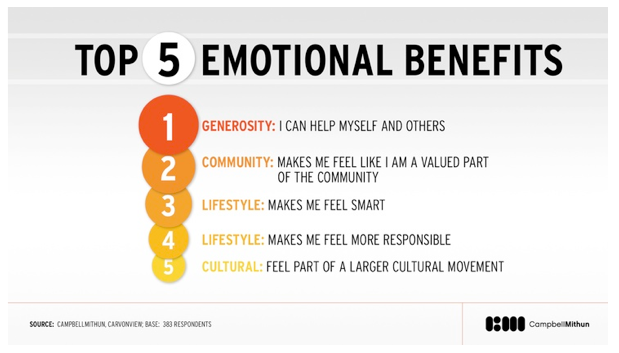 A questo proposito è interessante osservare quali motivazioni vengono indicate da chi partecipa alla sharing economy. La graduatoria indica nell’ordine che il risparmio di denaro, la difesa dell’ambiente, la flessibilità e la praticità dello stile di vita sono i principali benefici ‘razionali’ che derivano dall’economia collaborativa; mentre “aiutare me stesso e gli altri” e “sentirmi una parte apprezzata della comunità” sono i due principali benefici di tipo ‘emotivo’ indicati. Quello che è interessante, non sono tanto le risposte, pur rivelatrici, ma il modo stesso in cui sono poste le domande: ragione ed emozione sono separate già in partenza!