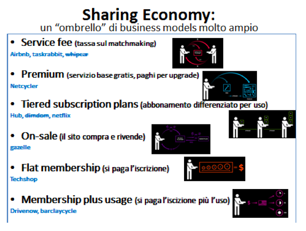 Botsman e Rogers (What is mine is yours. The rise of collaborative consumption, HarperCollins, New York, 2010) hanno utilizzato la frase ad effetto “Quel che è mio, è tuo” come accattivante titolo per il loro volume dedicato alla descrizione della sharing economy; il più realista The Economist ha completato la frase che è diventata “Quel che è mio, è tuo … pagando una commissione”. La stessa Botsman, peraltro, in un discorso pubblico rivolto ad una platea di imprenditori ha evidenziato come la sharing economy non sia necessariamente una alternativa al capitalismo, ma possa facilmente convivere con la massimizzazione del profitto. Diversi modelli di business (dall’abbonamento flat agli sconti per quantità; dalla commissione sul valore del bene scambiato/condiviso all’offerta differenziata per qualità di servizio) permettono il raggiungimento di tale obiettivo. Un economista classificherebbe tali modelli come variazioni sul tema della discriminazione di prezzo e della differenziazione del prodotto, tutte pratiche che, in generale, tendono ad ingrandire la fetta destinata al produttore della torta costituita dai guadagni dello scambio.