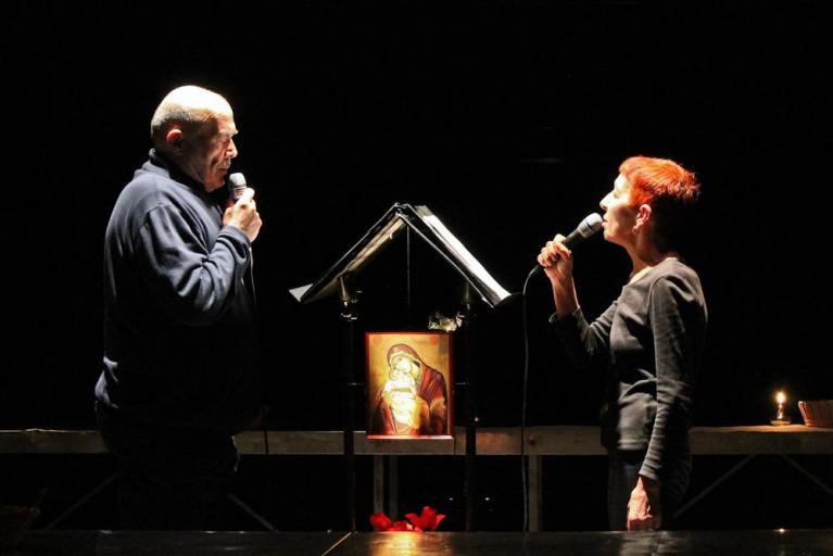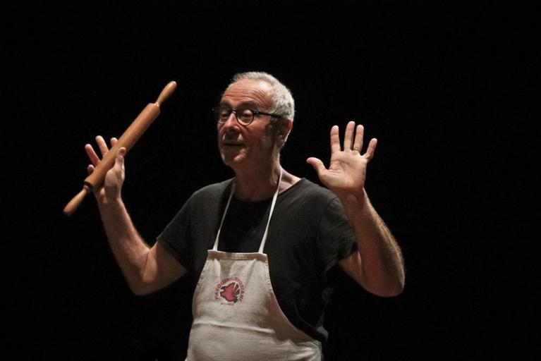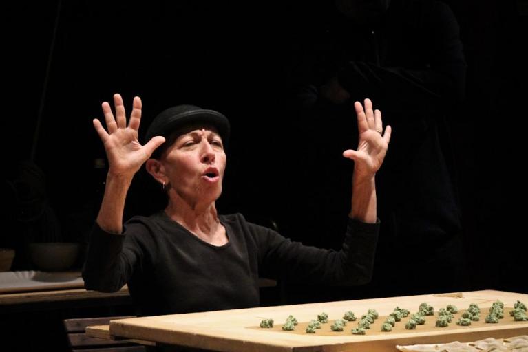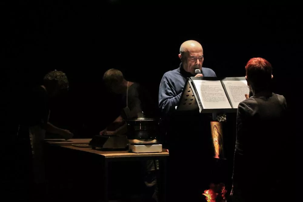 Il suo perimetro è ritagliato da due lunghe tavole imbandite dove siedono e mangiano gli spettatori. Davanti a questi ultimi, c’è poi lo spazio degli attori diviso in tre blocchi. Al centro, abbiamo un piccolo blocco occupato da due leggii, dall’immagine di una Madonna con il bambino, da un vaso di fiori e da una falce con martello. Qui Luigi Dadina e Paola Berselli leggono periodicamente alcuni estratti dal romanzo postumo Amado mio, dal poema in prosa Petrolio rimasto incompiuto e dalle poesie de Le ceneri di Gramsci di Pier Paolo Pasolini. Ai lati di questo blocco centrale, troviamo invece le ultime due zone, quelle in cui gli attori già citati (cui va aggiunto ora anche il nome di Maurizio Ferraresi) cucinano il cibo da servire agli spettatori e raccontano alcuni ricordi della loro infanzia. Troviamo così, in conclusione, spazi deputati a diverse attività. C’è lo spazio del cibo, lo spazio del lavoro delle mani che impastano e delle menti che si cimentano nella difficile arte del raccontare, e lo spazio della poesia, anzi della poesia politica e religiosa pasoliniana. Queste zone – pur chiaramente distinte – sono anche comunicanti, il che influisce sull’accadimento scenico nel suo complesso. La poesia di Pasolini esce dal libro per farsi cibo per la mente, mentre il pane e il vino serviti a tavola sono il frutto della passione degli attori-cucinieri, che oltre alla loro testimonianza condividono il sapere delle loro mani che sanno cuocere alimenti buoni e piacevoli.
