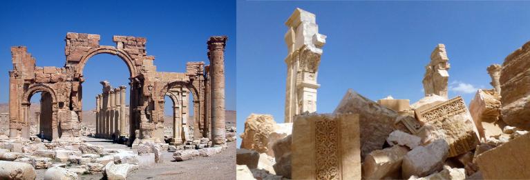 Arco trionfale a Palmira prima e dopo la distruzione avvenuta nel 2016. Foto Michael Nicholson/Corbis/Getty Images e Valery Sharifulin/Tass/Getty Images.