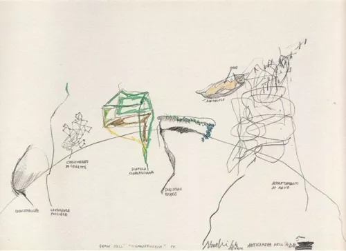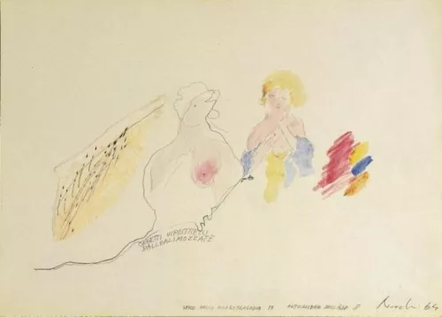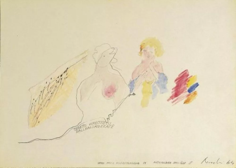Nell’esposizione milanese (a cura di Marco Rinaldi) ritroviamo, assieme a molti altri, anche questi lavori, e occorre dire subito che le tavole ispirate all’Hilarotragoedia manganelliana rappresentano uno dei punti di forza della mostra. Vediamo qui splendidamente all’opera quella commistione fra lirismo e ironia che caratterizza anche il lavoro pittorico di Novelli. Dovendo illustrare un testo, egli se ne appropria, trascrivendone a mano brani, singole frasi o sintagmi isolati, e associandovi immagini che non sono mai del tutto “figurative” ma sempre imprevedibili. Un discorso analogo si può fare per le altre collaborazioni, come ad esempio quelle con Samuel Beckett, per cui realizza quattro litografie destinate ad accompagnare un’edizione del testo L’image (progetto poi non concretizzatosi), e Pierre Klossowski, del quale illustra un’edizione tedesca di Le bain de Diane. Ma anche con gli italiani le interazioni sono feconde: si va dalle pregevoli tavole astratte a colori accompagnate dai versi di una giovanissima Dacia Maraini a quelle che si associano a poesie di Emilio Villa, Alfredo Giuliani ed Elio Pagliarani.