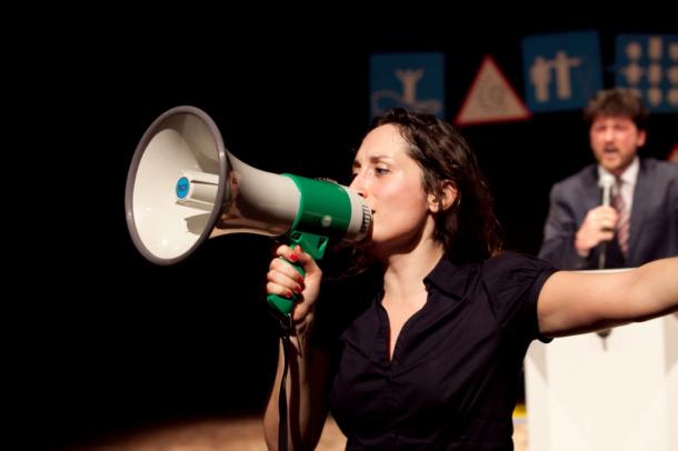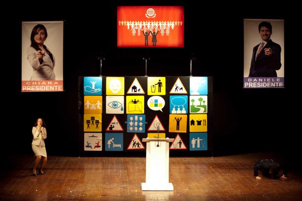 Qui, in modo eccessivo, clownesco, si porta gli spettatori nella costruzione di una piccola repubblica, circoscritta dai muri del teatro, che durerà il tempo dello spettacolo. Si mettono in scena le dinamiche di uno stato, la necessità delle regole e l’istinto a violarle, la democrazia e la tentazione di abusare dei poteri, dei diritti, della libertà che dà. Si coinvolgono gli spettatori in comizi per assicurarsi l’elezione a presidente, promettendo sempre più dell’altro candidato, non risparmiando colpi bassi, in un’iperbole che non potrà non essere disattesa, con esiti catastrofici. Si trasporta gli astanti nel corpo della democrazia, della difficile arte di convivere, facendo fare esperienza di alcuni passaggi che di solito la scuola affida a enunciazioni concettuali. Si sperimenta la difficoltà di vivere insieme; si percorre, ridendo, giocando, sporcando, inciampando, provando l’abisso del tradimento, della soperchieria, la necessità di farsi sentire e di ascoltare.