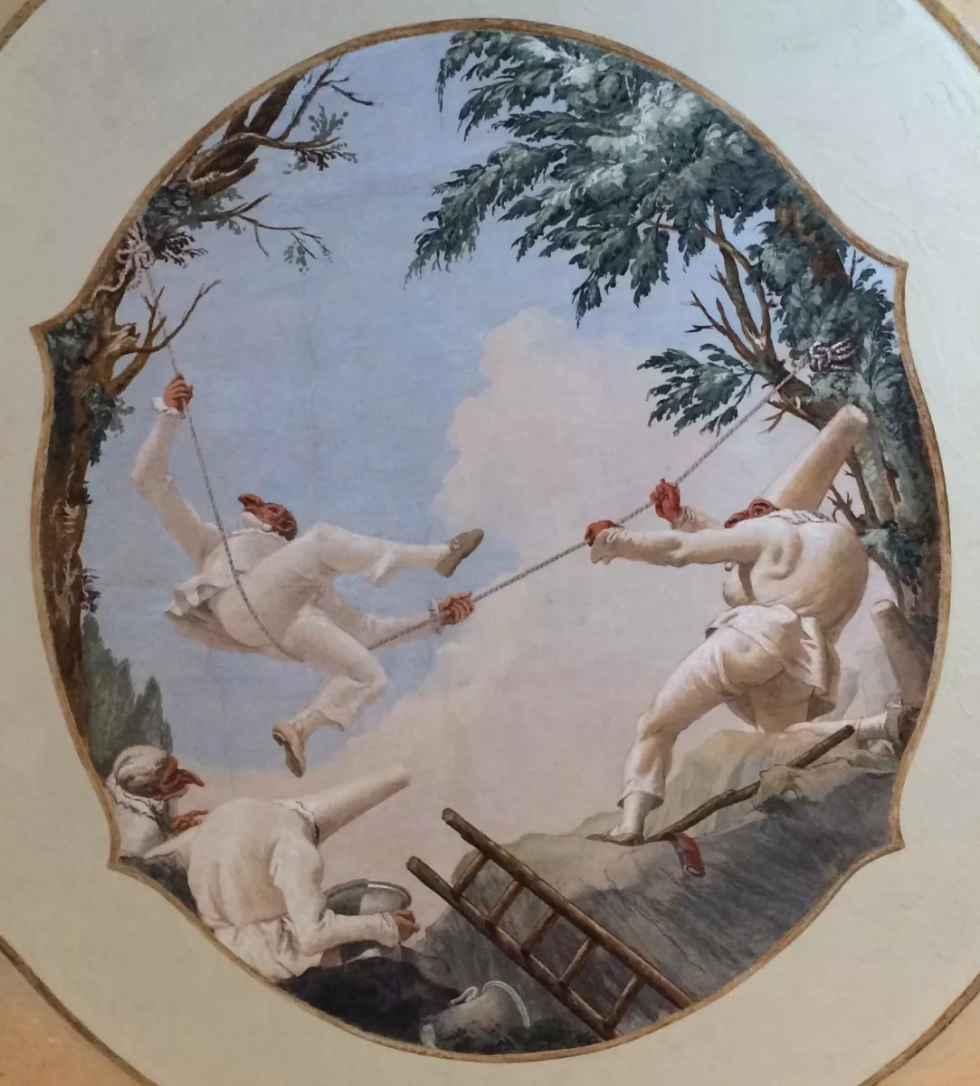 Ma anche negli affreschi è particolare l'uso del bianco. Sono tornata a Venezia su suggestione del libro di Agamben: al secondo piano di Ca' Rezzonico in due piccole sale sono ricomposti i dipinti della villa di Zianigo di Mirano. Nel Mondo nuovo una folla di schiena attende di partecipare allo spettacolo della lanterna magica, del cosmorama, curiosa di un progresso che si risolve in gioco; di fronte la coppia che accenna a un passo di danza, lei vestita di un bianco luminosissimo, poi, la dama che inizia la passeggiata con due cavalieri ammiccando all'indietro. Nella stanzina i Pulcinella che gozzovigliano, Pulcinella e i saltimbanchi e Pulcinella innamorato. I tondi monocromi rossi e i riquadri in bianco e nero – che sembrano in rilievo proprio per l'uso sapiente dei bianco – raccontano altri momenti della biografia della maschera. Nel dipinto del soffitto della stanzina, L'altalena di Pulcinella, i bianchi dei camicioni e dei copricapi, che non sono esattamente bianchi – come ha notato Isabella Valente nella scheda del catalogo Electa –, risaltano sul fondo della nuvola bianca e prendono luce dall'azzurro del cielo. La maschera nera di Pulcinella talora sembra fatta di pelle bruna e aderisce al volto fino a confondersi con esso; le fessure della maschera diventano semplici cerchi disegnati attorno all'occhio che richiamano lo stesso segno nei disegni di Giambattista.