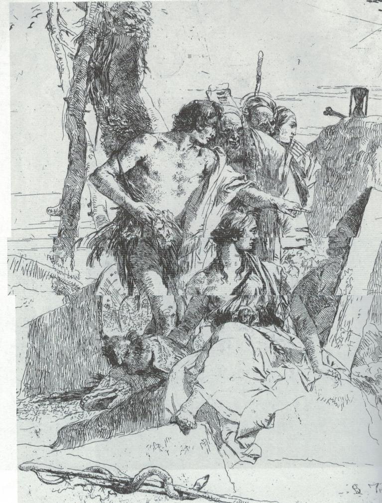 Giambattista Tiepolo, Pulcinella, due maghi e un efebo, acquaforte, Udine, Musei civici.