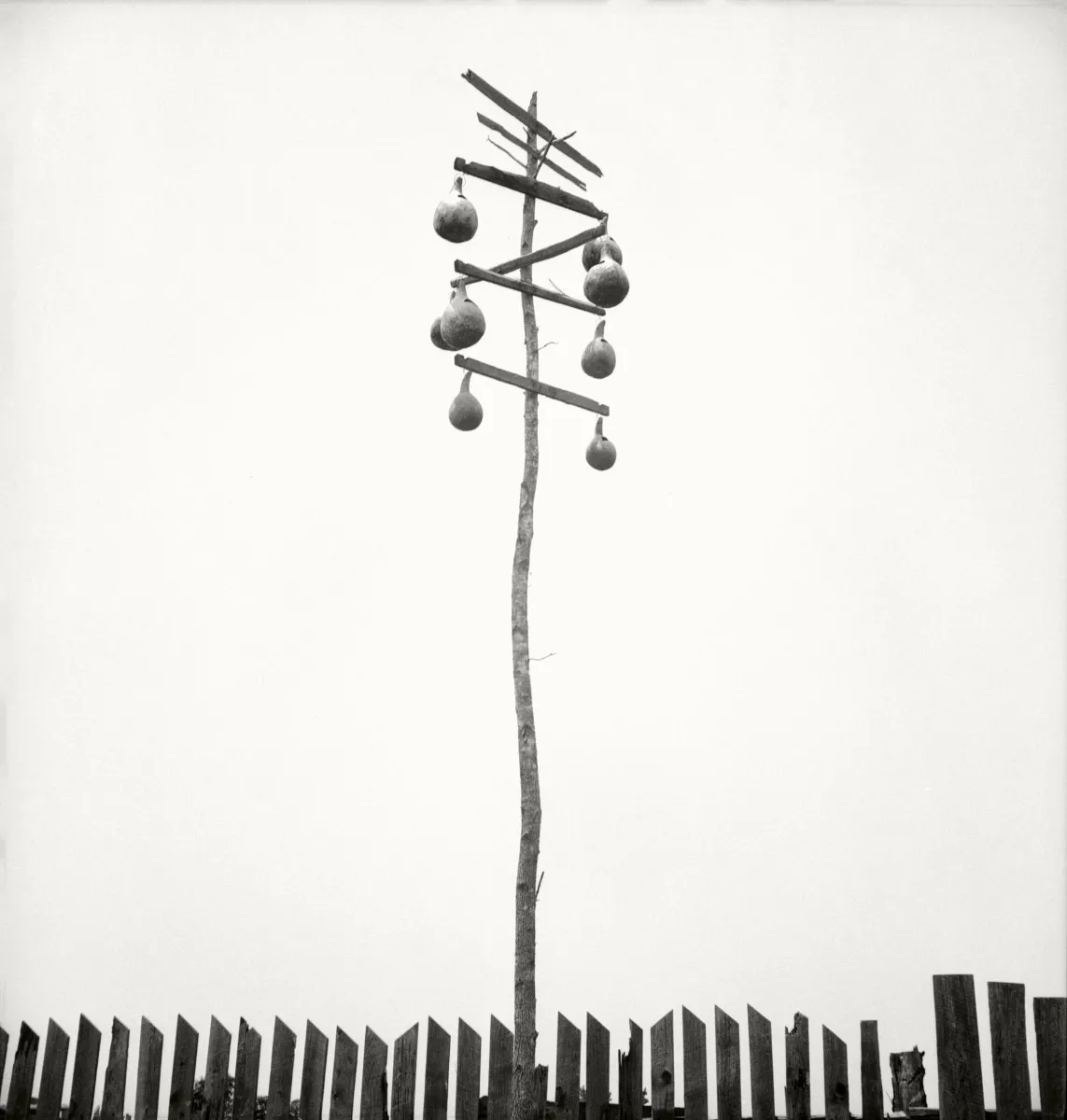 Tra gli stati visitati da Dorothea Lange, la Georgia non è uno in cui le condizioni sociali ed economiche fossero tra le peggiori – gli stati maggiormente colpiti dalle tempeste di polvere si trovano al centro degli Stati Uniti. Questo spinge a pensare che l’oggetto da lei ritratto non appartenga strettamente alla ricerca documentale sui contadini poveri americani commissionata dal Farm Security Administration (FSA), cui parteciparono negli anni Trenta i nomi più importanti della fotografia sociale, e non, americana del XX secolo. A colpire sono le forme rotonde appese alle barre di legno, le quali conferiscono all’asta il sapore d’un totem, sorta d’oggetto misterioso e insieme magico, quasi una scultura – almeno così appare ai miei occhi oggi. Ricorda il palo d’una linea telefonica forse dismessa; tuttavia non ci sono fili appesi. Perché in cima le traversine che si susseguono non hanno appese le buffe bocce? Sarà davvero possibile che le rondini s’infilino nei buchi aperti sulla superficie di questi contenitori dal sapore artigianale?