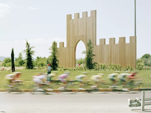 Si vede in primo piano la strada asfaltata di colore chiaro, sopra la striatura dei ciclisti come una lunga riga bianca con un punto rosso, dietro un prato con quattro striminziti alberi, un signore che scatta una fotografia, presumibilmente con un cellulare, poi una bicicletta appoggiata a uno degli alberi, mentre di lato, a destra, un pezzo di un guardrail. Su tutto domina il retro di un’installazione di legno che mima la forma di un castello. Una fotografia con un raro senso della composizione e quei fantasmi in primo piano che scappano via, ma di cui resta l’impronta sformata. Sono loro i protagonisti della fotografia e al tempo stesso non lo sono. Le immagini esposte da Cecé Casile contengono la medesima scena, cambia solo – si fa per dire – il fondale. La corsa, che è la protagonista dello scatto, è presente e insieme assente, mentre quello che si vede distintamente sono i luoghi dove il Giro è passato. La gara è un lampo. Ha la forma stessa della velocità ed è l’avvenimento per cui le persone s’assiepano lungo il percorso della carovana. Il paesaggio è la cosa che resta, che si fissa in queste fotografie. Non è il paesaggio-paesaggio, quello memorabile, da ricordare.