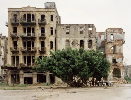 L’inverso di quanto accaduto nella capitale libanese. A Pripyat le rovine proseguono ancora oggi la loro dissoluzione. Tra le tante immagini scattate da Basilico in quel viaggio a Beirut – uno dei quattro viaggi da lui compiuti nella capitale libanese nell’arco di qualche decennio – questa con il sempreverde al centro è quella che mi colpisce di più. Per via dell’albero davanti alle abitazioni devastate: un’oasi cresce verso l’alto, e ancora prima si slancia di lato. Le case, prive di finestre e semidiroccate, sono ancora lì. Poi sotto il cappello verde, all’ombra, c’è un carretto, anzi due carretti, e i due venditori (saranno davvero due, o è uno solo, quello seduto sulla sedia?).