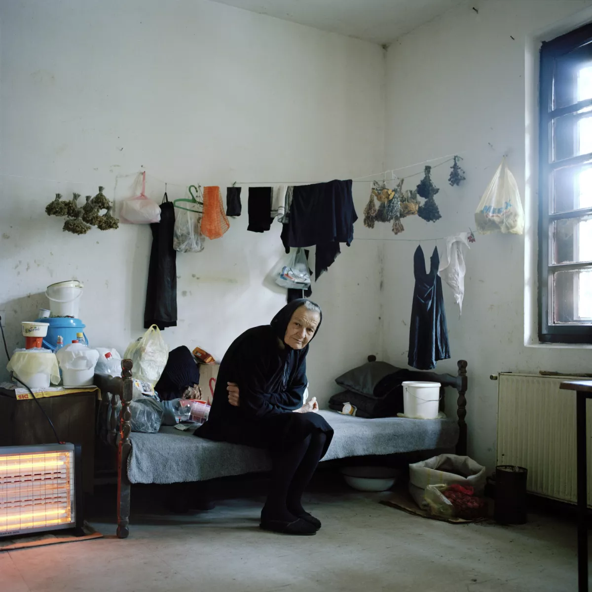 Un filo teso tra due muri proprio sopra il letto sul quale sono appese le proprie cose ad asciugare: vestiti e frutti della terra raccolti in mazzetti ben ordinati. È un angolo della stanza quello in cui si trova il suo giaciglio, anche questo utilizzato come piano d’appoggio; altre cose sono riposte in sacchetti e contenitori di plastica ai piedi del letto. Poi lei, Stana Davidovic, una donna anziana originaria di Hrvatska Kostajinica. Sopravvissuta alla Seconda guerra mondiale, Stana Davidovi ora vive in un centro collettivo per rifugiati a Rtanj in Serbia, luogo che prende il nome da una montagna dei Carpazi dalla forma piramidale. Stana Davidovic ha deciso di non rientrare in Croazia dove viveva dopo la devastazione del suo villaggio, nonostante la sorella vi abbia fatto ritorno. Lei è rimasta. Sarà una profuga per sempre, accampata in questo luogo impervio nella regione orientale della Serbia. È lei la protagonista di questa fotografia (2006-2008) scattata da Ivor Prickett, un fotografo nato in Irlanda che da anni segue le guerre in quella parte devastata del mondo: Balcani, Caucaso, Siria, Iraq, e ora anche Ucraina. Vive a Istanbul e pubblica le sue immagini sulla prima pagina del The New York Times.