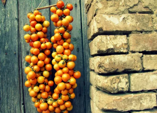 Dentro, per me, era una sorpresa dietro l’altra: altri pacchetti, incastrati uno accanto all’altro per non perdere nemmeno un centimetro cubo di spazio utile. In cima a tutto, per preservarle dallo schiacciamento, due trecce di pomodorini invernali.