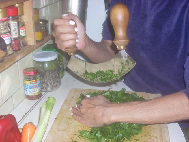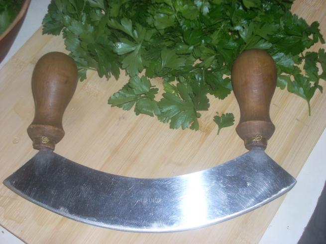 E finalmente arrivava la parte più bella. Radunata la montagnola sul tagliere, brandivo la mezzaluna e zinzinzin in una direzione, zinzinzin nell’altra... la lama dondolava ipnotica affondata nel verde, cavalcavo praterie prendendo raggi sempre più ampi, con la mano tiravo vicino i fuggiaschi, zinzinzin... zinzinzin..., la piramide calava trasformandosi in poltiglia, pulivo la lama col dito, ne usciva un profumo inebriante, il sugo verde tingeva il legno del tagliere, Tocca a meee!, incalzavano gli altri, Ok, un attimo!