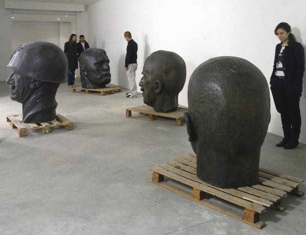 Quando, nel 2006, inizia ad esplorare con l’artista olandese Kevin Van Braak una serie di architetture di epoca fascista nella città di Roma, Rossella Biscotti ha appena realizzato l’intervento La cinematografia è l’arma più forte: la frase in caratteri littori che Mussolini aveva utilizzato come slogan in occasione dell’inaugurazione di Cinecittà viene riprodotta fedelmente sul muro di un ambiente espositivo vuoto e, successivamente in altre occasioni, proiettata sugli schermi in diverse sale cinematografiche prima delle normali proiezioni. L’intervento rappresenta un aspetto importante dell’opera dell’artista: quello del suo rapporto con lo spazio. Architettonico o urbano che sia, lo spazio in Biscotti ha sempre una connotazione molto precisa: anch’esso è in relazione con la storia, con il valore simbolico, ideologico o utopico che ne ha informato il progetto e condizionato l’uso nel corso del tempo: dalla utopia comunitaria della fabbrica Olivetti di Napoli progettata da Luigi Cosenza e oggi trasformata in centro servizi interinali, alla ideologia fascista della scuola di scherma di Luigi Moretti trasformata in aula bunker, alla tipografia anarchica di Carrara, al muro perimetrale del lager di Bolzano oggi completamente nascosto dalla successiva urbanizzazione. Sono questi momenti di passaggio da un significato all’altro, da una forma ad una altra ad interessare l’artista, così come risulta in maniera ancor più evidente in alcune sue ‘performance urbane’: anche qui è il tragitto da un luogo ad un altro che trasforma il significato dell’oggetto o dell’azione: come le Teste in oggetto che in un giorno attraversano tutta la città dal loro deposito nei sotterranei dell’EUR sino allo spazio espositivo per farvi subito ritorno o, come nell’azione Dalla stazione marittima al Ministero del lavoro e delle politiche sociali, a Napoli, in cui un uomo con un mattone in ottone in mano percorre il tragitto dichiarato nel titolo: un processo dunque che diviene spazio, luogo, itinerario e che assume valore di metafora.