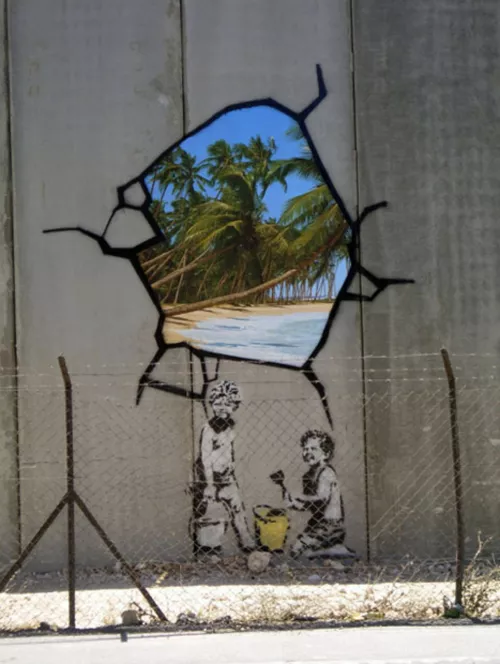 Uno squarcio in trompe-l’œil disegnato sull’imponente muro che separa Gaza da Israele, posto un po’ rialzato da terra, apre su un cielo incredibilmente azzurro, un mare blu e verdi palme. Luoghi paradisiaci: niente guerra né campi profughi al di là.