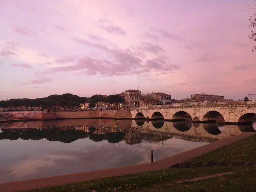 Scendendo da via Garibaldi e svoltando per via Malatesta si può raggiungere la Chiesa di Sant’Agostino che conserva un mirabile ciclo di affreschi della scuola giottesca emersi dopo il terremoto dell’estate del 1916 (vicenda pittorica densa ma che si chiude in appena mezzo secolo a causa della peste del 1348), da cui proviene anche l’imponente Timpano del Giudizio Universale oggi conservato presso le Sale del Museo della Città; oppure passare della settecentesca Pescheria Vecchia, dove i fiorai usano ancora gli antichi banchi in pietra e la sera i ragazzi si accalcano fino a tarda ora a bere e, mi pare, a baciarsi troppo poco. Infine, ci si può sedere sulle scale del duecentesco Palazzo dell’Arengo, nella nodale Piazza Cavour, per riposare un po’, o arrivare a Castel Sismondo, sotto le cui poderose mura i bambini si rincorrono dentro e fuori gli specchi d’acqua che rievocano le nebbie di Amarcord.