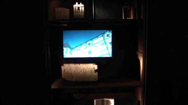Poco più in là una biblioteca ospita oggetti di origine oscura posti accanto a uno schermo che proietta la facciata di un palazzo rinascimentale riflessa nell’acqua.