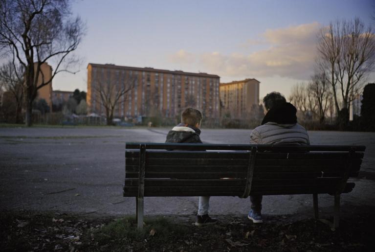 Mi è capitata un’occasione di contatto con le persone con questa fotografia, che ritrae il padre e figlio seduti sulla panchina; poco prima del crepuscolo. Gli ho domandato se potevo fotografarli nella posizione in cui stavano. Non mi hanno chiesto perché. Mi ero comunque presentato come uno che stava fotografando i dintorni. Tutto molto rapidamente: uno scatto, un ringraziamento e un saluto. Non so se guardassero a un futuro migliore, desiderando un trasloco, magari abitavano nel palazzo fatiscente che avevo fotografato nei giorni precedenti, oppure chiacchieravano compiacendosi della loro nuova abitazione che avevano di fronte, alla quale mi sembrava guardassero e che è un palazzo più bello.