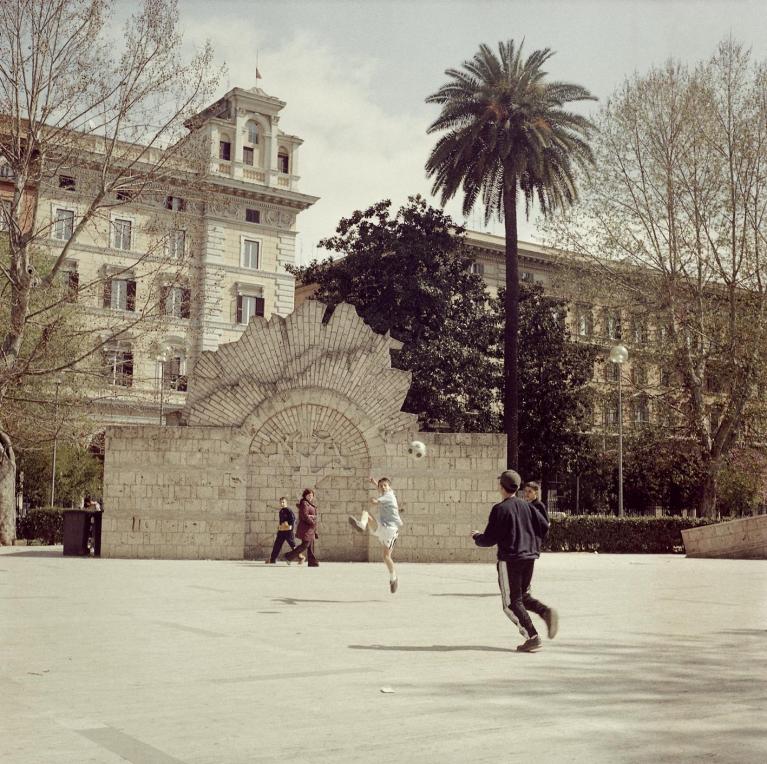 Di questa foto non ricordo nulla, o quasi. Ricordo che avevo ancora la Rollei, l’avevo comprata di seconda o forse terza mano. Ricordo che ero a Roma… innamorato della ragazza con la quale l’anno dopo ci feci un figlio e per poi separarci qualche tempo dopo. Non ricordo come mai mi trovassi a Piazza Vittorio, forse ero appena arrivato in città o forse stavo andando in stazione per ritornare a Milano; perché ero andato a trovarla appunto a Roma. Comunque camminavo da solo in quel momento. Avrò guardato verso la piazza e scattato la foto ai ragazzini che giocavano a pallone.