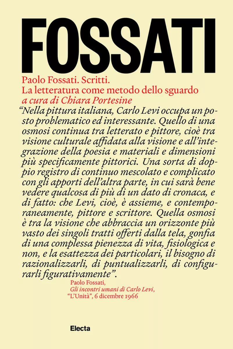 Per giorni interi non ho fatto altro che leggere (e rileggere) i libri di Paolo Fossati, spinto a farlo dalla nuova e corposa antologia dei suoi Scritti. La letteratura come metodo dello sguardo, da poco pubblicati per i tipi di Electa, Milano 2024, con l’attenta cura di Chiara Portesine. È una «combinazione di tessere tematiche» ben congegnata la nuova antologia del «Fossati letterato», che raccoglie testi giornalistici e recensioni, interventi del critico «militante» e saggi sparsi insieme a capitoli di alcuni libri. E perfetta è la copertina (il libro, che inaugura una collana di Scritti in cui seguiranno presto quelli di Paolo Volponi e di Marco Vallora, nelle sue oltre quattrocento pagine, per coerenza, non contiene nemmeno una illustrazione). Poiché la copertina è solo grafica, anch’essa senza immagini, ne risulta che sia lo stesso brano di scrittura riportato a diventare immagine. E il succinto brano che in copertina sigilla la sinestesia parola-immagine è altrettanto ben scelto. Riporta un estratto dell’articolo Gli incontri umani di Carlo Levi, comparso su «L’Unità» del 6 dicembre 1966, dove Fossati parla dell’«osmosi continua tra letterato e pittore, cioè tra visione culturale affidata alla visione e all’integrazione della poesia e materiali e dimensioni più specificamente pittorici…».