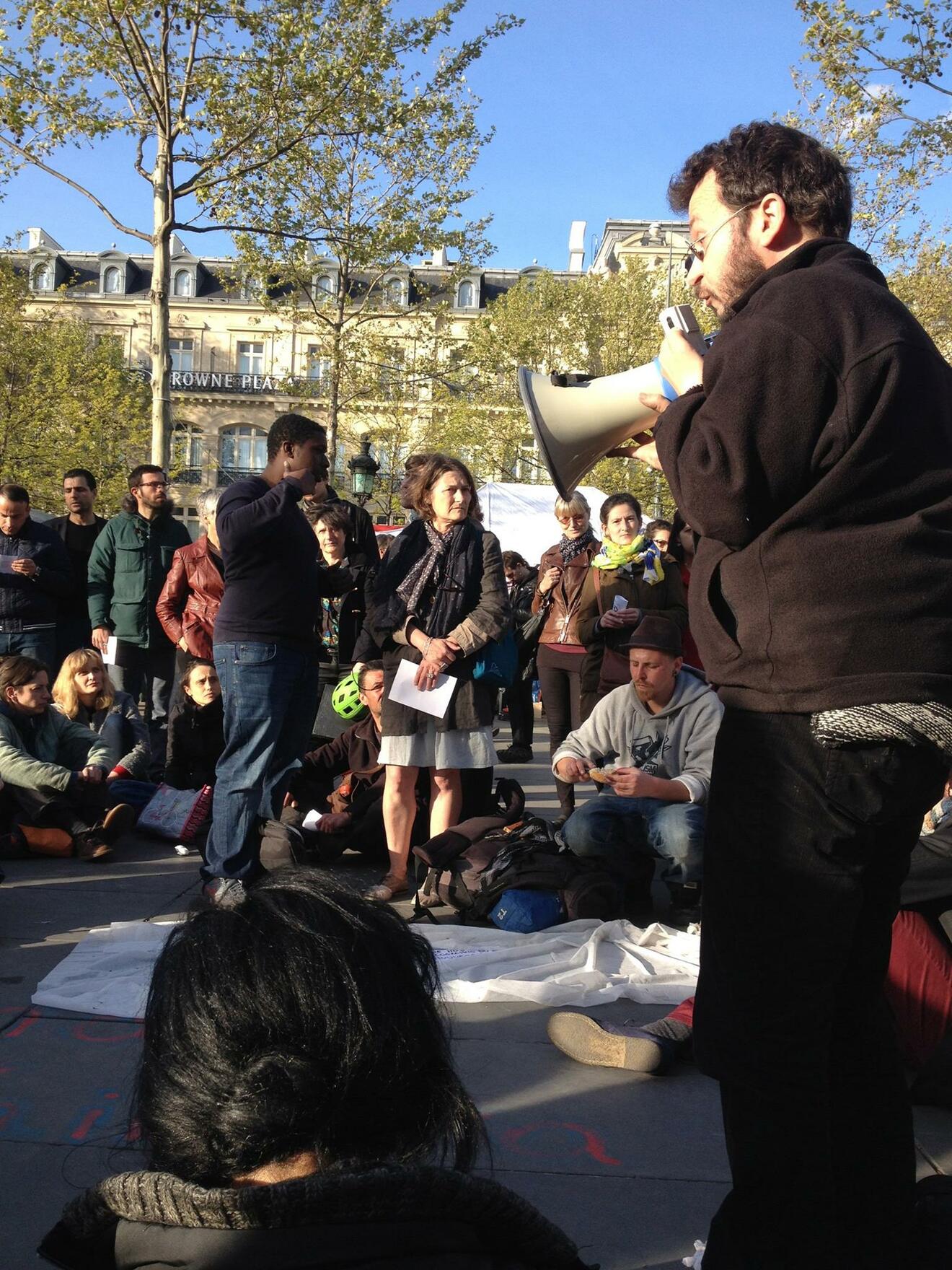 Ci sono tornata di giorno, saltuariamente, ho visto in effetti le commissioni al lavoro, sedute in cerchio in vari punti della piazza: la commission écologie, la commission grève générale, la commission éducation, la commission féministe, la commission françafrique, la commission économie politique, la commission sdf («sans domicile fixe», senzatetto)… ho visto i loro esponenti alternarsi ai cittadini sciolti e riferire al microfono – in due minuti di tempo cronometrati da volontari dal polso più o meno fermo – esiti di riflessioni o proporre spunti per azioni più o meno capillari.