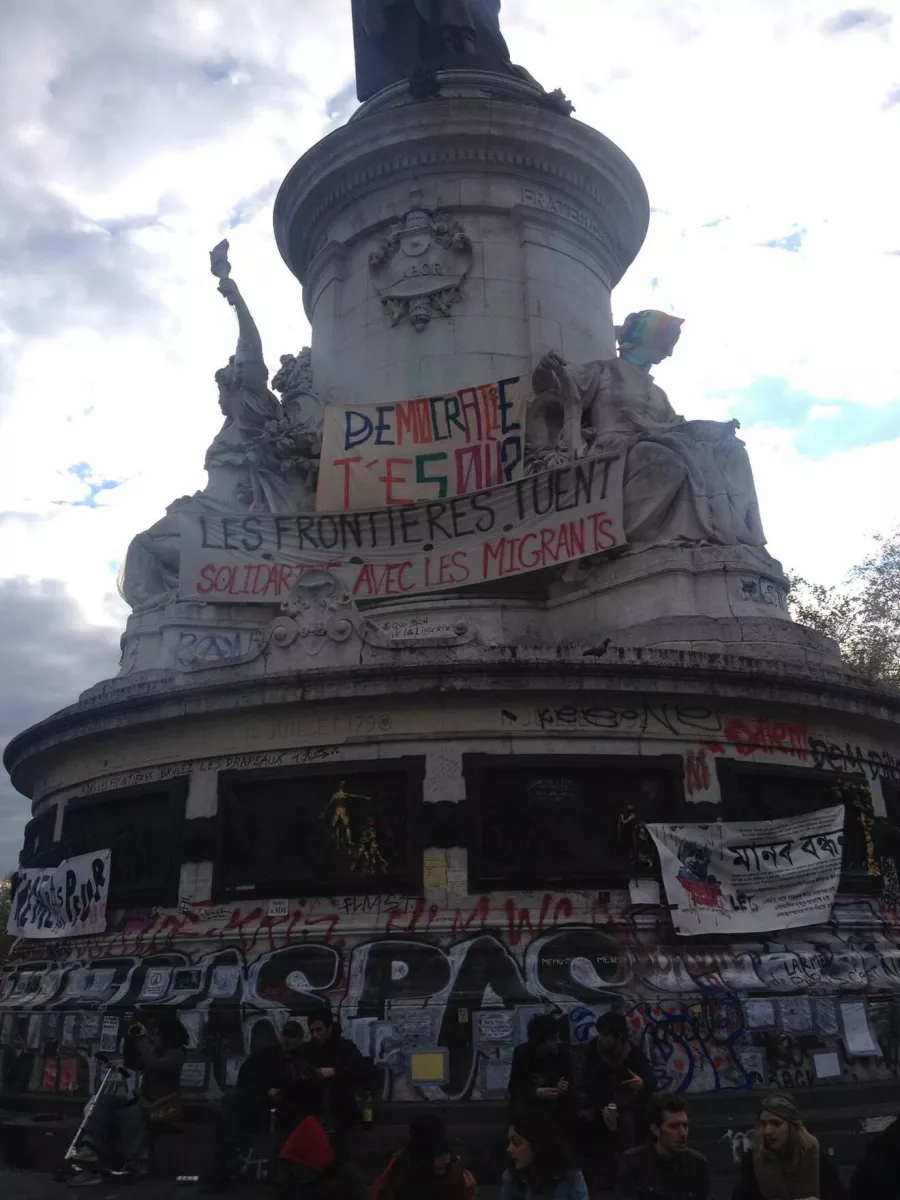 Il #38 marzo dunque verso mezzanotte vado a République con la mia amica e collega Yasmina Melaouah, a Parigi per qualche giorno ed entusiasta del movimento. Fa un freddo boia e dal cielo cade il maledetto «crachin» (molto opportunamente traducibile con «sputacchio»). All’estremità est della piazza, una tettoia di tela cerata (ora emancipatasi in gazebo) e due altoparlanti e, davanti, gente assiepata che ascolta chi a turno prende il microfono e dice la sua sulla situazione sociale e politica del paese, su quello che vorrebbe veder cambiare, su quello che… ma sto facendo un salto in avanti, perché quella sera al microfono passavano ragazzotti mediamente sbronzi e sconnessi che mi facevano sentire più vecchia di quello che sono, e molto delusa ho detto a Yasmina: «mais c’est n’importe quoi!» (in italiano, forzando un po’, ma che cazzata!); una frase che oggi mi manda in bestia quando la sento dire dagli scettici di passaggio, e che forse quella sera ha irritato anche Yasmina, la quale però non si è lasciata smontare e ha insistito: no, davvero, tu che abiti qui, tornaci di giorno.