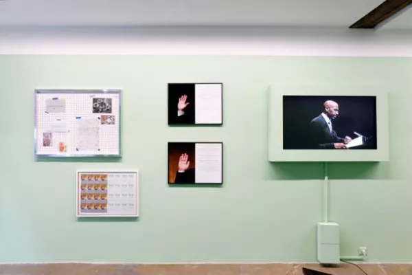 Esattamente a partire da queste domande si sviluppa Enacting Populism, mostra in programma in questi giorni alla Kadist Art Foundation di Parigi a cura di Matteo Lucchetti. Enacting Populism si fonda su un gioco evidente di intersezioni tra pratica artistica e gesto politico. Vero e proprio luogo ambiguo, lo spazio espositivo della Fondazione Kadist è stato organizzato e strutturato come la sede di un comitato elettorale, un ufficio politico temporaneo di quelli che durano lo spazio di una campagna e che vengono smobilitati il giorno successivo alle elezioni. Del comitato elettorale presenta infatti gli elementi di arredo: il verdino dei muri, le sedie, i tavoli di formica (presi in prestito direttamente dal Partito Comunista francese). Dell’ufficio politico possiede il carattere del tutto provvisorio (la mostra è stata allestita in coincidenza degli ultimi due mesi delle presidenziali francesi e terminerà il 22 maggio, giorno delle elezioni).