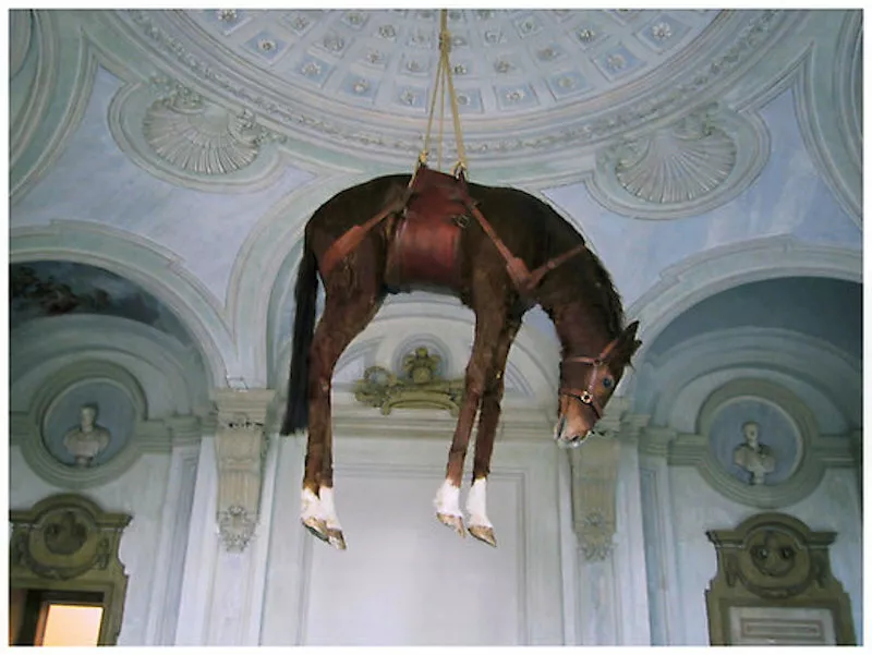 Cosa ne sarebbe dell’opera di Maurizio Cattelan senza la tassidermia? Difficile immaginarlo: l’artista si è servito di animali «naturalizzati» lungo tutto l’arco della sua carriera, dallo scoiattolo che, in un improvviso blues, si toglie la vita in cucina (Bidibibodibiboo, 1996) ai duecento piccioni che infestarono il padiglione italiano della Biennale di Venezia (Turisti, 1997). In questo pantheon animale, un posto d’onore spetta al cavallo, da quando fu appeso al soffitto, sopra la testa dei visitatori, stretto in un’imbracatura di cuoio (Trotsky, 1997). Una volta liberatosi, se così possiamo ricostruire quanto seguì, il cavallo si mise a correre all’impazzata all’interno delle sale d’esposizione in cerca di una via di fuga, finché spiccò un salto per oltrepassare un ostacolo bianco. Peccato che si trattava di una parete, contro la quale sbatte il muso, restando sospeso a mezz’aria (Untitled, 2007). Il risultato è un cavallo acefalo che pende dal muro come un trofeo di caccia, la testa sostituita dalla coda e dal crinale.