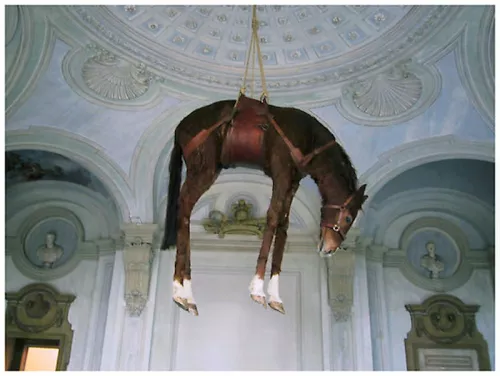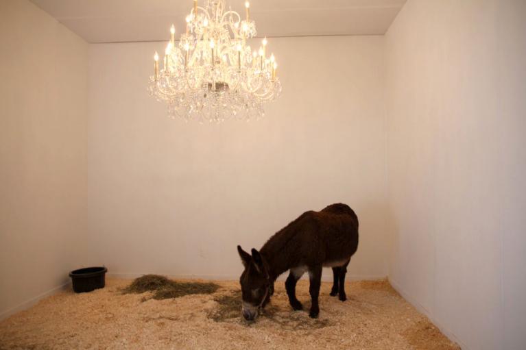 Nel 1969 Jannis Kounellis trasformò il garage-galleria L’Attico di Roma in una stalla, esponendo dodici cavalli legati alle pareti. Come se il cavallo, soggetto tradizionale della pittura di paesaggio e della scultura commemorativa, si fosse ribellato a questo ruolo angusto, riappropriandosi dello spazio reale. Senza trattenersi dal pisciare nel garage di Fabio Sargentini, come mostra bene una foto d’epoca. Se Kounellis ha ripetuto quest’azione cinque volte in Europa e un’ultima volta alla galleria Gavin Brown di New York (giugno 2015), Cattelan sembra prendersi gioco di tali reenactement. Per la sua prima mostra negli Stati Uniti (Daniel Newburg Gallery, 1994), espone un asino – che aveva già calcato le scene del Metropolitan Opera ne La Bohème o Il barbiere di Siviglia – minacciato da un lampadario di cristallo che pende sopra la sua testa (Warning! Enter at Your Own Risk. Do Not Touch, Do Not Feed, No Smoking, No Photographs, No Dogs, Thank You, 1994).