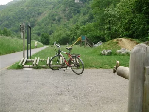 E in effetti, i primi otto km in discesa all’andata, verso il fiume, sono puro piacere: sui bordi erbosi della pista pascolano cavalli e qualche mucca, che osservano un po’ perplessi l’andirivieni dei pedalatori. Ti senti in armonia, le montagne d’intorno ti sorridono, le gambe girano che è una meraviglia. Poi arrivi sul fondovalle, il Serio scorre sulla tua sinistra, ti godi lo scroscio dell’acqua fra i massi, lo sentite? Arrivi alla fontanella fra Casnigo e Pontenossa (vedi foto 1), è in legno d’abete come tutte le altre, le producono in Alto Adige; ti abbeveri e riempi la borraccia, il sole sta calando, decidi di tornare.