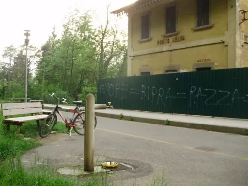 Adesso il fiume ti accompagna sulla destra, i primi tre km sono in leggera salita, cominci a sentire la fatica, entri nel bosco, innesti il rapporto dell’anziano, l’ascesa si fa dura, tutto appare un po’ meno bucolico. Ai piedi dell’ultimo strappo, la seconda fermata, (vedi foto 2). Qui un tempo passava la ferrovia, sei sotto la vecchia stazioncina di Ponte Selva abbandonata ormai da più di quarant’anni: sulla lamiera che protegge il passante dai calcinacci in caduta libera, la scritta AMORE=BIRRA=RAZZA=STERMINIO ti rammenta ogni volta che anche fra i boschi non c’è salvezza.