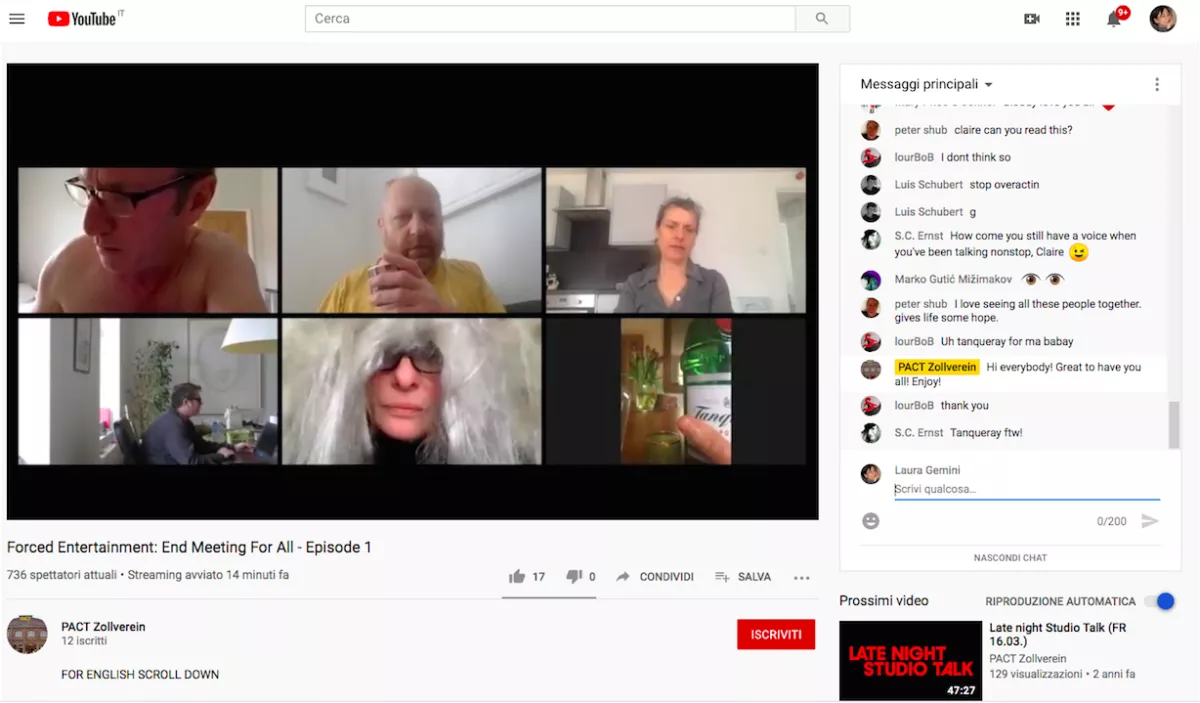 Le potenzialità live dell’online – che non sono certo una novità nel panorama della sperimentazione artistica – sembrano trovare oggi delle importanti possibilità di attualizzazione e, soprattutto della chance di normalizzazione che lo stato di necessità permette di sondare. Basti pensare alla programmazione del 16 aprile scorso di Be Arielle F, lavoro del videoartista svizzero Simon Senn co-prodotto dal Théâtre de Vidy di Losanna e andato in diretta su Zoom a seguito dell’annullamento del Festival; oppure la serie di tre puntate >End Meeting For All< realizzate su Zoom da Forced Entertainment e trasmesse su YouTube lo scorso 28 aprile (prima serata con circa 750 persone collegate in remoto) e in programma per il 5 e il 19 maggio prossimi. In entrambi i casi, la dimensione interessante riguarda l’uso delle piattaforme come dispositivi che attivano una grammatica partecipativa forte, tanto che, per certi versi, la comunità temporanea di spettatori connessi in contemporanea (ora ma non qui) e interagenti è l’elemento che garantisce la riuscita di questo tipo di operazioni.