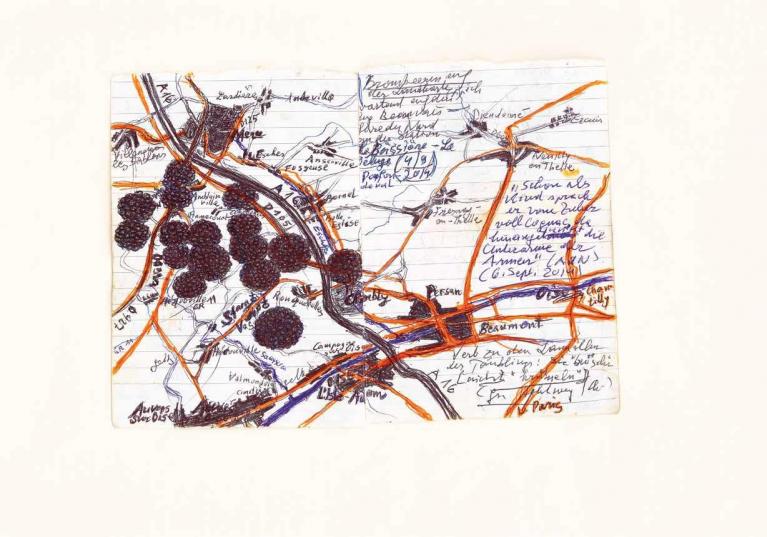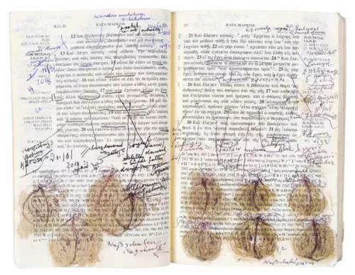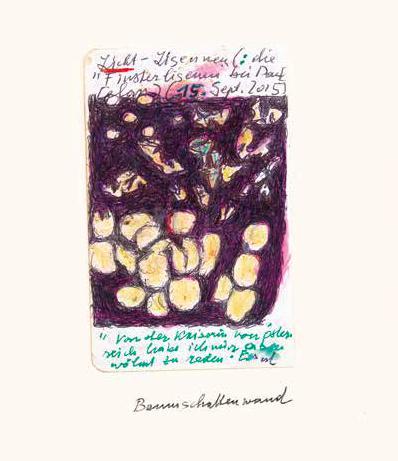 La scrittura diventa un luogo riparato nel bosco, nascosto fra alberi e frasche, rifugio infantile e magico, in mezzo a foglie di faggio di un marrone chiaro (“Per un attimo è come se lì nel folto fossero sparse delle carte da gioco – che poi giacciono per sempre sul terreno in tutta l’estensione del bosco, luccicando e piegandosi al più lieve soffio di vento”). Da una parola che evoca immagini della natura a disegni che la riproducono mescolandosi agli scarabocchi degli appunti scritti, il passo è breve. La poetica di Handke è riassunta, almeno in parte, da alcune righe della sua Intervista sulla scrittura (Lubrina, 1990): “Solo la parola marginale, il-dire-ciò-che-si-deve-con-voce-rotta, sarà da udire in eterno. Questo lo so. Non certo le parole potenti”. I disegni, come un microcosmo leggero e pacificante, saranno sempre gli avversari peggiori di quelle “parole potenti”.