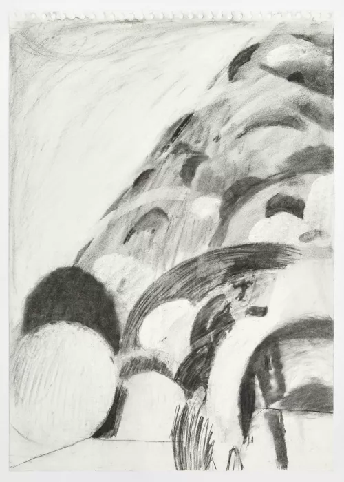 A far da contraltare alla partitura cromatica delle opere pittoriche ci sono le carte, disegni in bianco e nero dal tratto libero e aggressivo. Nei disegni la figura umana si palesa, pur rimanendo forma tra le forme. In assenza di colore, il dialogo tra profondità o superficie scarta verso la bidimensionalità del segno e la scala dei grigi, dei neri e dei bianchi determina le forme: “esplorare, dare forma attraverso il bianco e nero del carboncino (in passato ho lavorato spesso con il colore sulla carta) a contrasti di contenimento e aree selvagge, punti di vista oscurati, occultamento contro rivelazione”. Levità e freschezza rimangono intatte, la matrice figurativa si fa più chiara, quasi che la nettezza del segno grafico la costringesse a emergere dal biancore della carta, appare un urgenza del segno che si fa largo nello spazio del foglio. Un ritmo più alto rispetto alle tele, dove l’artista può lasciare che il colore a olio rivendichi il tempo che gli è necessario per tradursi in pittura, scegliendo il ritmo della propria andatura, dove la dicotomia tra solidità e trasparenza può dispiegarsi e la materia può esprimersi compiutamente, tra velature e blocchi di colore, minute epifanie, immagini che affiorano dalla corsa placida del pennello e galleggiano, come animate da una nuova vita ed emancipate, infine, dal giogo della memoria.