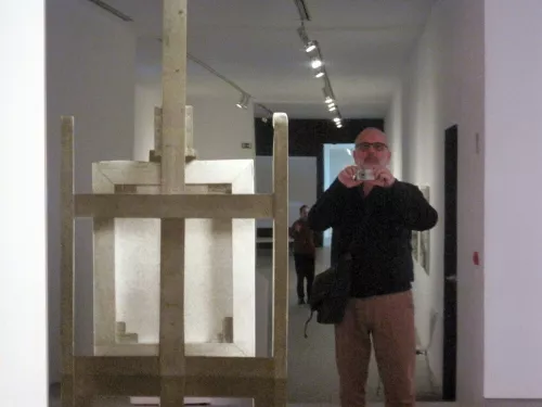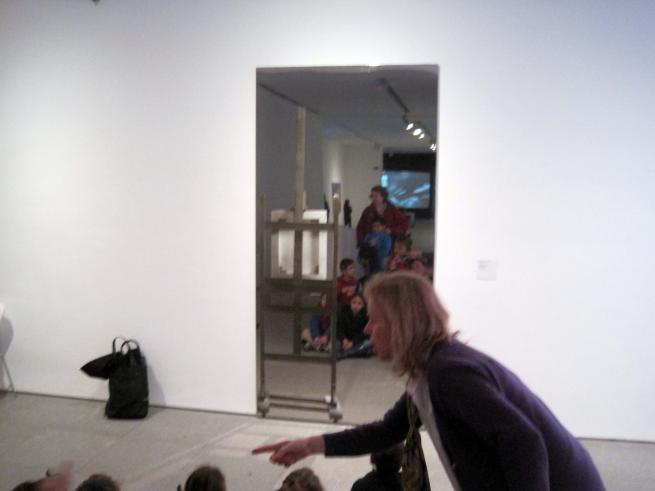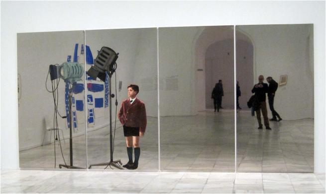 La rivincita arriva davanti a un’opera di Michelangelo Pistoletto che, come ognuno sa, usa abitualmente specchi a mo’ di sfondo dei suoi quadri, di modo che la persona che li guarda si ritrova forzatamente a far parte dell’opera. L’osservatore dentro l’immagine, e con lui tutto ciò che gli fa da sfondo, in modo programmaticamente casuale. Per di più, nell’opera in questione sullo specchio è dipinto un cavalletto molto simile a quello di Las Meninas di Velasquez (esposto al Prado, a due passi da là), di modo che lo spettatore può stare là dentro non solo come protagonista ma al modo del pittore, in una vertigine costruita ad hoc per smarrire e insieme divertire il pubblico di passaggio. Cosa che puntualmente accade. Io fotografo il quadro, dentro il quale stanno specchiati i frugoletti che a turno mimano le pose stereotipe di un artista secentesco.