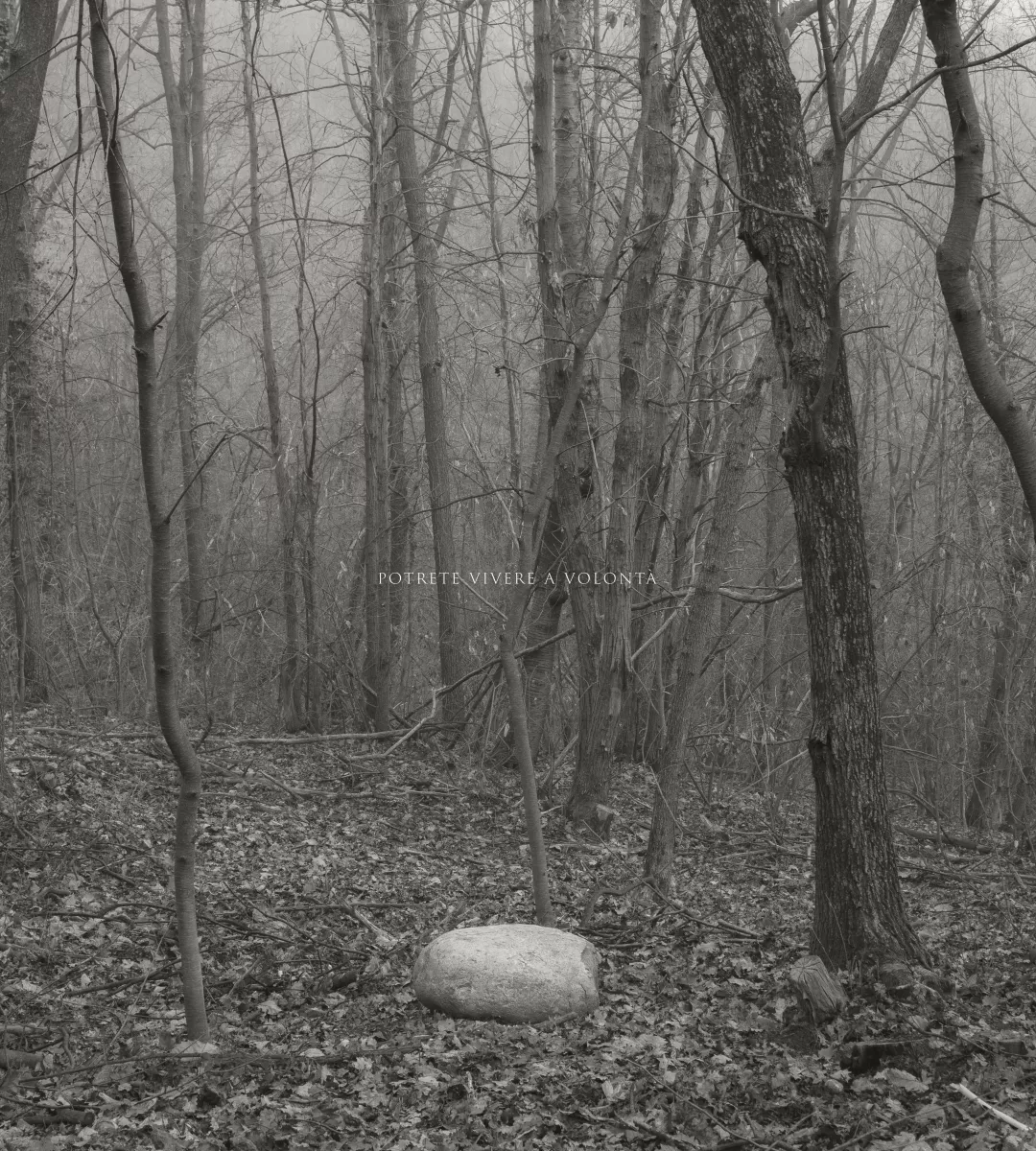 PF: Sì, qui c’è un sasso. Anche questa è una situazione che ho trovato, non preparata, diventa quasi un totem, qualcosa intorno al quale celebrare un rito, o anche solo la sua singolarità. Un albero da solo non è bosco; quando lo scorgiamo in una radura, distante dal bosco oscuro, meraviglioso, che cosa dice al nostro inconscio di uomo-scimmia? È come se l’albero davvero si manifestasse, ci raccontasse con forza il suo esistere. Forse così è nata quella devozione per certi alberi o altro già nel paleolitico: la pianta sacra, la montagna sacra, soggetti isolati, isolati e dunque più veri, che pare tengano lontano tutto il resto, difendendosi, difendendoci. Così è anche per quel sasso.