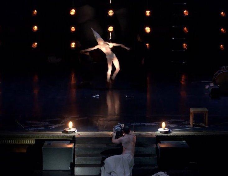 La Fatina appare, prima di Pinocchio, come un essere misterioso, piccola grandissima donna, voce profonda, presenza magnetica, depositata sotto un velo, come un dono, da un gigantesco danzatore, un Mangiafoco che diventa sostegno a magici pas de deux con quel corpo lucente e diverso, quello di Chiara Bersani, attrice piccola, piccolissima e gigantesca di sensibilità e presenza.