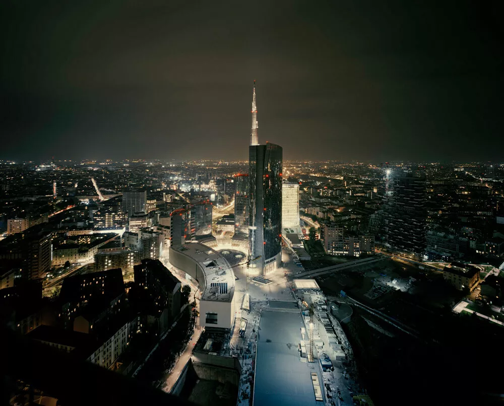Se avrai modo di guardare il libro ti accorgerai che a un certo punto, qualche anno prima della sua scomparsa, Basilico aveva cominciato a fotografare Milano in un modo diverso, a colori, come del resto faceva da tempo per le cento città del mondo che ha ritratto nella sua incredibile attività di topografo della postmodernità [Qui alcune immagini pubblicate su Internazionale]. In fondo al volume ci sono diversi scatti dedicati all’area Garibaldi-Repubblica, dove sono sorti negli ultimi anni gli alti edifici, i grattacieli, che hanno cambiato lo skyline di Milano: la torre Pelli dell’Unicredit, il cosiddetto Diamante, i due boschi verticali di Boeri, il grattacielo della Regione e gli altri edifici residenziali, che fanno somigliare quel luogo di Milano alle altre città del mondo che hanno innalzato grattacieli nel loro centro come un inno alle “magnifiche sorti e progressive”.