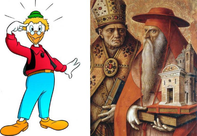 Giro Girlolamo (Archimede Pitagorico) personaggio inventato negli anni Cinquanta da Carl Barks / Carlo Crivelli, dettaglio dei Santi Ansovino e Girolamo, post 1490. Scomparto destro del Polittico del Duomo di Camerino. Venezia, Gallerie dell’Accademia.