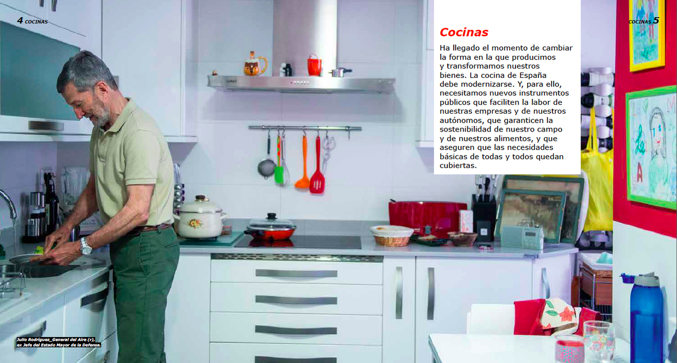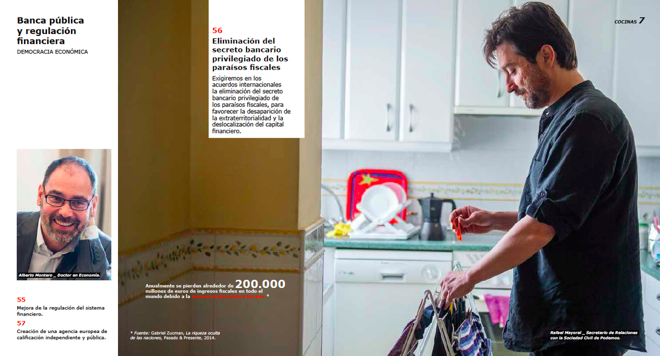 Poi subentra lo studium, la ragione per la quale guardo l’immagine, ed è allora, forse, che andiamo con gli occhi alla scritta, in cerca di cosa una cucina abbia a che fare con una Spagna nuova. È arrivato il momento di cambiare il modo in cui si producono e si trasformano i beni, dicono quelli di Podemos, e per questo la cucina di Spagna deve modernizzarsi. Ecco perché la cucina, perché è il luogo della trasformazione, è questo il filo. Il motivo per cui, allora, il generale lavi i piatti e non stia cucinando rimane un mistero, ma sembra che la metafora – ecco cosa è il catalogo di Ikea, una metafora – funziona. O almeno, lo fa per una intera pagina. Perché basta sfogliare e troviamo Rafael Mayoral, segretario delle relazioni con la società civile di Podemos, intento a stendere i panni in uno stendino che – colpo di scena – si trova in cucina. Il tema della pagina sono le banche e la gestione finanziaria, anzi, più in dettaglio, la proposta di eliminare il segreto bancario privilegiato dei paradisi fiscali. Capito? Eliminazione del segreto bancario…panni sporchi…sagace. Ma è quello che volevano dire o è quello che ho voluto vederci io? Non lo sapremo mai. Ma soprattutto, che c’entra la cucina? El señor Mayoral non ce l’ha una lavanderia, un balcone, qualcosa? E perché anche lui sorride? Oddio, ancora il punctum: che ci fa quella moka gigantesca nella sua cucina? Ama il caffè italiano? Carine le piastrelle con i fiorellini gialli…e la moglie? Eccetera eccetera eccetera.