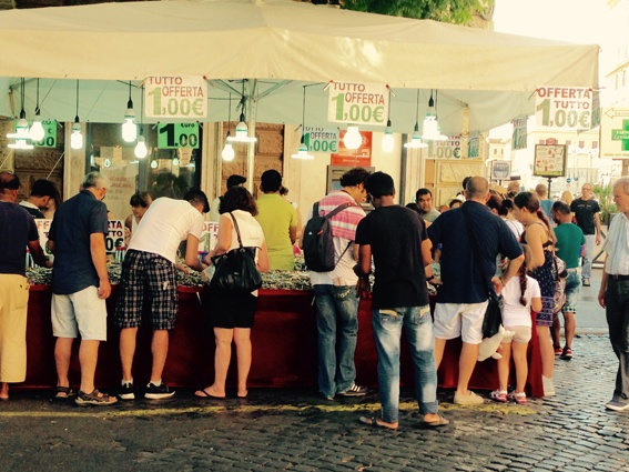 Mi incammino lungo via Cola di Rienzo. C’è poca gente, le commesse dei negozi hanno un’aria impigrita. Anch’io sento di muovermi come un elefante. Colpa del caldo afoso. Seguo una coppia che gravita verso l’ingresso del mercato rionale. Entro dietro di loro e vengo avvolto in un ambiente scuro e caldo. Quell’aggettivo – rionale – prometteva qualcosa che non mantiene. Immaginavo un’atmosfera pittoresca, vociare allegro, profumi di salumi. E invece la metà dei banchi è chiusa, il resto espone per la maggior parte paccottiglia per turisti: mutande con scritto I love Italy, cravatte di plastica a 5€, trolley, elmi legionari, finti borsalino, magneti da frigo. C’è da dire che soffro di una curiosa idiosincrasia per i cosiddetti mercatini. Più questi mercatini hanno carattere popolare e più hanno il potere di procurarmi lo sbadiglio. Sono allergico anche alle sagre paesane. Frequentavo un tempo una comitiva di persone che ogni fine settimane puntava una sagra in qualche paesello del Lazio o della Toscana. Roba come la sagra della ficamaschia dorata (è un tipo di merluzzetto ripassato in padella) a Porto Ercole, o la sagra della sagna pelosa in Ciociaria. È questa una delle ragioni per cui ho smesso di bazzicare le comitive. Temo che l’Italia sia una repubblica fondata sugli assaggini della coldiretti.