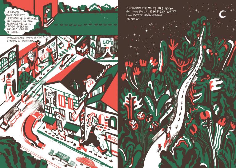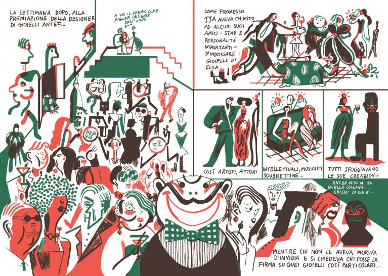 Sarah Mazzetti, in I gioielli di Elsa, elabora un linguaggio coltissimo e personale e lo mette al servizio di un fumetto per piccoli la cui protagonista è una bambina. Leggendo la sua avventura vengono in mente Buzzati ed Elsa Morante (e chissà se il nome della candida, tenerissima e impavida protagonista deriva da questo splendido fantasma): la Morante tredicenne di Caterì dalla trecciolina, il Buzzati scrittore dell’Invasione degli orsi in Sicilia, e il Buzzati pittore di alcuni Miracoli di Val Morel e di certe Storie dipinte, come l’ex voto Serata Asolana, e i quadri Ragazza che precipitaAll’insegna della gastronomia e Le mille e una notte. Due riferimenti fondamentali per quell’attitudine geniale a portare, attraverso una ricercata ed esatta imperfezione di stile, direttamente ai regni dell’infanzia. Elsa non mangia i canditi del panettone, li trasforma in inauditi gioielli che scatenano negli adulti intorno a lei fanatismi di esaltazione e invidia. Dalle stelle del successo piomberà nel volgere breve di un attimo alle stalle della catastrofe: in una notte i gioielli di Elsa, venduti in tutto il mondo, scompaiono senza lasciare traccia. Elsa dovrà allora scoprire l’arcano e per farlo scenderà, come capita sempre agli eroi, nel mondo infero, dove patteggerà con una tribù di formiche giganti: dal successo effimero e di patinata idiozia decretato da uno stilista da manuale, ai meandri della Terra in cui si cade a precipizio verso il reame dell’Es e dei misteri infantili. Sarah Mazzetti non sbaglia un colpo e supportata da un occhio precisissimo nel far quadrare caos della vita e ordine della pagina, conduce il lettore in una storia surreale, un po’ balenga come lo sono certe incongruenze dei racconti infantili, supportata da un esuberante estro fantastico e da un’ironia sopraffina. Mazzetti è brava a disegnare, ma in pari grado a scrivere.