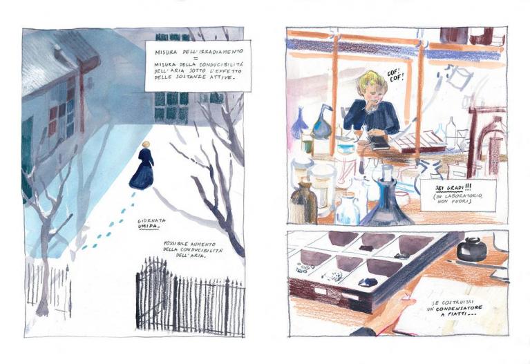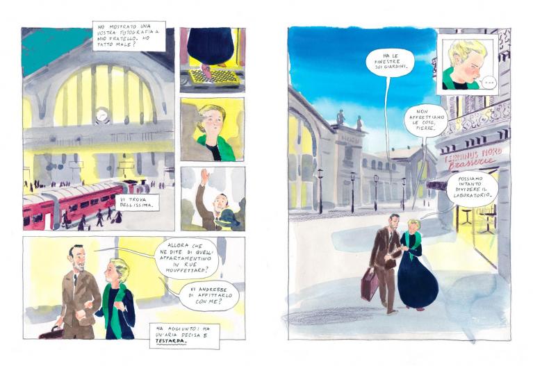 Misura è la parola che mi viene in mente leggendo la Marie Curie raccontata da Alice Milani, autrice che trova materia congeniale nel racconto biografico, come indica il precedente volume edito da Becco Giallo e dedicato alla vita di un’altra Nobel polacca, Wisława Szymborska. La storia è tratteggiata con la cautela di chi si accosta consapevolmente al mistero di ogni esistenza, in un progressivo avvicinamento alla complessa personalità di una protagonista dalla vicenda umana e scientifica straordinaria. Milani tesse il racconto intrecciando vita privata e pubblica e ispirandosi, si direbbe, al linguaggio grafico delle affiche europee dei primi del Novecento, in cui convivono secessione, espressionismo e art deco. Meravigliose tavole di interni, scorci di strade, visioni di città, paesaggi, edifici, danno conto, con la precisione di una visione poetica esatta, dei tempi e degli spazi della vicenda. Dentro vi si muovono i protagonisti, seguiti con attenzione, e senza approssimazione dei contenuti scientifici anche là dove la strada si fa impervia per il lettore comune (Alice è supportata da una famiglia di scienziati, la madre, Anna Nobili, il padre Andrea Milani, rispettivamente docenti di fisica e matematica all’Università di Pisa). La storia del pensiero e dell’importanza di Marie Curie in ambito scientifico, come iniziatrice della fisica nucleare, è anche quella, complessa e sorprendente, delle sue vicende umane e sentimentali, meno note ma sicuramente importanti per capire il personaggio. Esemplare, fra gli altri, il modo in cui viene restituito il legame con il marito, Pierre Curie. Il risultato di questa cura narrativa, è un racconto piano, coerente, rigoroso, cucito su misura a una figura femminile che ne esce illuminata: di grazia severa, intelligenza limpida e sconfinata, animata da un senso profondo di giustizia e verità.