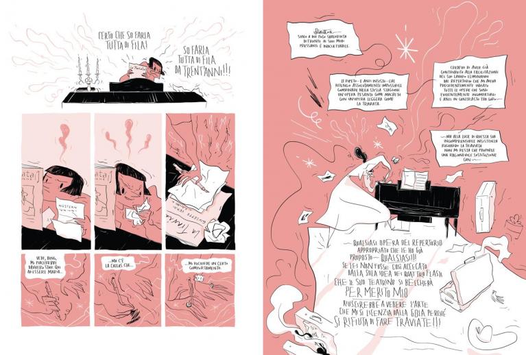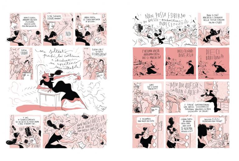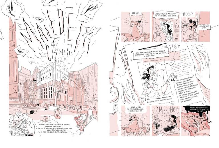 Si muove su tutt’altro registro Sempre libera, biografia di Maria Callas scritta e disegnata da Lorenza Natarella. Folgorata da un acuminato ritratto biografico della cantante scritto da Camilla Cederna nel 1968 ed edito da Longanesi nella collana “Gente famosa”, Natarella decide su due piedi di dedicare due anni e qualcosa a scrivere e disegnare la Callas. La Cederna non è solo il tramite col personaggio famoso, ma una maestra di stile, una che usava la penna in modo così magistrale da fare stare nella stessa pagina politica, cultura, costume, lotte sociali, pettegolezzo, dramma, mondanità senza che vi si percepisse contraddizione. Quello sguardo è congeniale a Lorenza che per Origami su “La Stampa” scrive esilaranti cronache al vetriolo su temi di attualità. Lo spirito è quello, e in comune c’è un’idea di stile che sia smalto: brillante, ironico, scatenato, diabolico, ma controllato al millimetro. Maria Callas è un personaggio così complicatamente noto da offrire un terreno scivolosissimo e al tempo stesso ideale, soprattutto per chi come Natarella mira a un ritratto da una parte filologicamente esatto (anche nella materia musicale), dall’altro estremizzato al parossismo. Dall’infanzia di Maria a New York, in costante compagnia della grifagna madre Evangelia, alle lezioni ateniesi di canto con Elvira de Hidalgo, alla conquistata indipendenza alla ricerca del successo internazionale prima in America e poi in Italia, alle nozze con Meneghini, fino al successo planetario – dalle Traviate alle Caste Dive, alle Norme, alle Tosche alle Medee –, all’amicizia con Visconti ed Elsa Maxwell, ai piaceri nomadi della mondanità, agli scontri con i direttori dei maggiori teatri d’opera del mondo, agli amori ellenici, Lorenza Natarella dà una lettura irresistibile di Maria Callas e della sua “vociaccia”: ne fa due personaggi elettrici, angolosi, fra eccessi, ferrea disciplina, furie, implacabile forza di volontà. Due prime donne descritte da un segno vibratile, che non si placa fino all’ultima pagina: segno accompagnato da una scrittura impeccabile, per cui Natarella ha un talento raro, che è la vera ossatura di questa biografia.