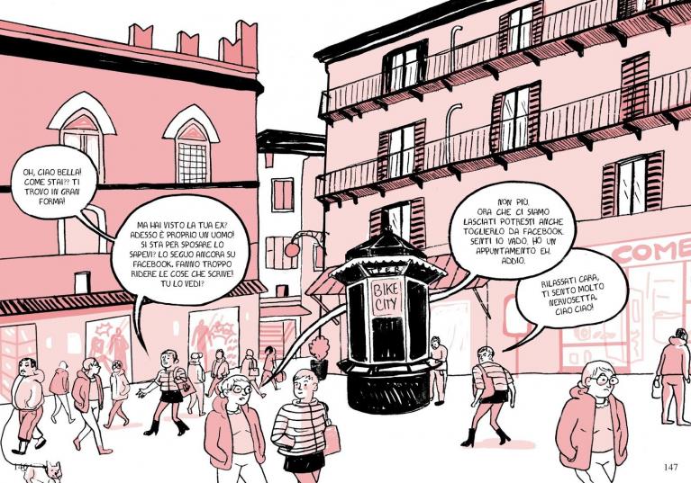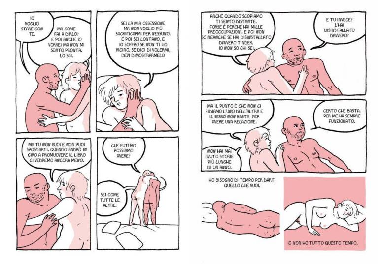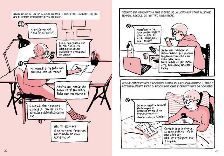 Non so chi sei di Cristina Portolano è una dettagliata disamina sulle relazioni sessuali, amorose e affettive al tempo di Tinder, app per incontri che vanta, come dichiara il suo sito, 50 milioni di utenti e ‘20 miliardi di compatibilità trovate fino a oggi’. In crisi per una storia d’amore che si è appena chiusa per la decisione della compagna di affrontare il cambio di genere, la protagonista, che si presenta come la stessa autrice, in cerca di distrazione dalla solitudine e dalla ‘pesantezza che si sente addosso’, decide di fare l’esperienza di appuntamenti al buio attraverso le tecnologie social. La prima cosa che ho pensato, leggendo questo graphic novel, è che è abbastanza straordinario come una materia così spinosa e potenzialmente ‘scandalosa’ come quella del sesso casuale per una ragazza, diventi, in mano a questa fumettista, una occasione di riflessione quasi filosofica sui rapporti umani, e non solo fra uomini e donne, fra amanti di un’ora, ma per esempio, anche fra amici, genitori, figli, coinquilini, sconosciuti in treno o persone di età diverse.
