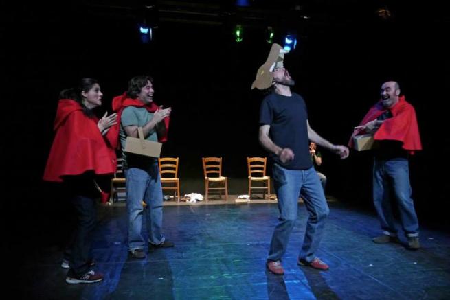 Bastano una maschera di carta, una pistola di legno o una testa di cavallo ugualmente in legno, un giubbotto con cappuccio bianco e occhiali di plastica, una tuta sempre di plastica di altro colore, una smorfia, un getto di sangue segnato con un pennello intinto di rosso su una maglietta bianca, per questo teatro antico delle meraviglie. Certo ci vuole l’ironia, la sensibilità, il senso del comico come ferita, divisione, estraneità da un mondo senza dolcezze di Giovanni Guerrieri e soci per dare corpo a queste impalpabili, coinvolgenti fumisterie, sguardi sull’abisso con sorriso un po’ goliardico un po’ da stupiti abitanti di un altro, più delicato, mondo.