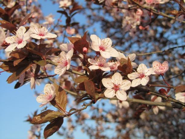 Relegati i fruttiferi nei suburbi, i centri abitati festeggiano il nuovo sole con le corolle rosate dei pruni pissardii, eletti per il fogliame rosso bruno a far macchia dopo la spettacolare, effimera fioritura.