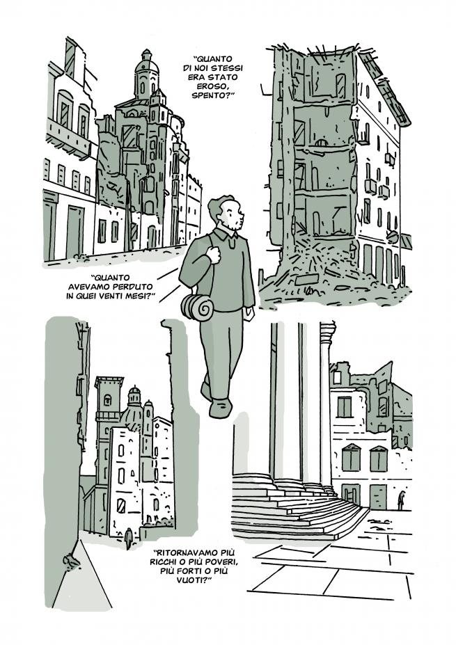 Questa problematicità è il risultato di Auschwitz, l’effetto di quella avventura estrema, oppure nasce prima, appartiene a Levi stesso? Forse entrambe le cose, anche se non sappiamo bene perché e come. Il suicidio non è il punto culminante della sua vita, quello che dovrebbe spiegare tutto, non è la prova del nove del suo senso di colpa, della vergogna (cose che ci sono, e molto presenti, nella sua opera), ma uno degli altri aspetti che definiscono quest’uomo così forte, duro, resistente, ricco di umanità, e insieme così delicato e fragile. La fragilità dell’uomo è uno degli aspetti che Scarnera mostra con più evidenza, ma senza che questo vada a detrimento della sua personalità; anzi, Levi esce da queste tavole come un personaggio notevole, in cui forza e debolezza si mescolano insieme dando un rilievo ancora maggiore alla sua figura di uomo e di scrittore. Robert Gordon l’ha detto in modo icastico nel titolo di un suo libro: Levi possiede le virtù dell’uomo normale. La sua straordinarietà consiste proprio nel paradosso di un uomo normale (e di buona memoria).