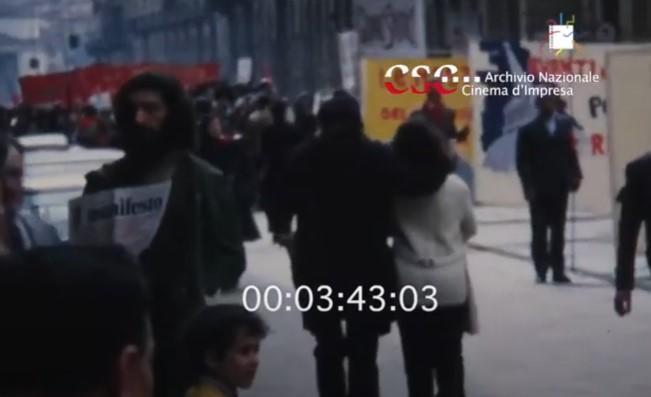 Ed infatti, fatalmente, l’idillio finora descritto è turbato, un minuto prima della fine, da un’apparizione storicamente giustificata e insieme antropologicamente incongrua. La macchina da presa sta inquadrando una lunga serie di striscioni dipinti con slogan e, forse per dare respiro alla ripresa, incomincia una lenta panoramica a sinistra. Entra così in campo un giovanotto che non assomiglia per nulla all’umanità che abbiamo visto finora. Non si è rasato e non è vestito bene. Ha capelli lunghi, una barba incolta e porta con sciatteria un eskimo senza imbottitura. In mano ha un plico di copie di “Il Manifesto” da vendere. La sua presenza è ambigua, perché da una parte sembra far parte del contesto generale, dall’altra sembra del tutto fuori posto. Per un attimo, dentro quei fotogrammi, è come se convivessero due diverse storie della sinistra italiana.
