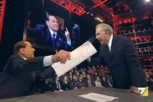 Si può desumere tutto questo dal gesto innocuo e spiritoso di pulire una sedia? Non è eccessivo? Tutto in Silvio Berlusconi è senza dubbio eccessivo, dalle sue esternazioni verbali a quelle fisiche, dalle feste ad Arcore del Bunga Bunga al recente fidanzamento con una giovane ragazza di 29 anni. Egli si trova in uno stato d’ipomania e iperattività, per cui vive in uno stato di assoluto presente, senza passato (sempre riscritto a uso del presente) e del futuro (parola che usa molto poco, perché per lui evidentemente fa rima con morte). Solo un uomo convinto in modo assoluto di questa capacità di modellare il mondo intorno a sé, anche a costo di negare i propri fallimenti o errori, poteva sostenere un confronto con i propri avversari in un talk show come quello di ieri sera. Combatte come un vero gladiatore contro i leoni (metafora berlusconiana), perché non può fare altrimenti spinto dalle proprie pulsioni interiori.