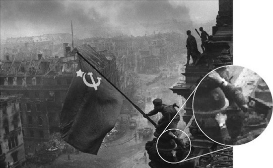 La storia di quella bandiera, ricavata da una tovaglia rossa vista l’impossibilità di trovare nella Berlino devastata un autentico gonfalone sovietico, e soprattutto della memorabile fotografia che ne immortalò lo sventolio sul Reichstag conquistato, merita una breve digressione. Il fotografo di guerra Evgenij Chaldej la scattò dopo avere costruito la scena, a battaglia ovviamente terminata. Negli anni successivi la fotografia dovette essere ritoccata visto che ai polsi di uno dei soldati immortalati erano vistosamente riconoscibili due orologi, traccia delle poco onorevoli razzie compiute dall’Armata Rossa durante la marcia verso Berlino.